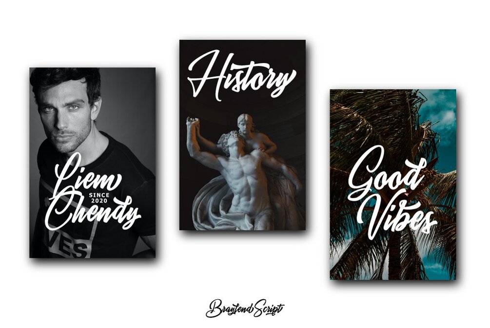 Introducing new latest from TebTipsudio, Braylend is a script typeface with personality. You can use it as a logo, badge, insignia, packaging, headline, poster, etc The alternative characters in this font were divided into several OpenType features such as Stylistic Alternates, Stylistic Sets, and Ligature. The OpenType features can be accessed by using OpenType program such as Adobe Illustrator, Adobe Photoshop, and Adobe InDesign.