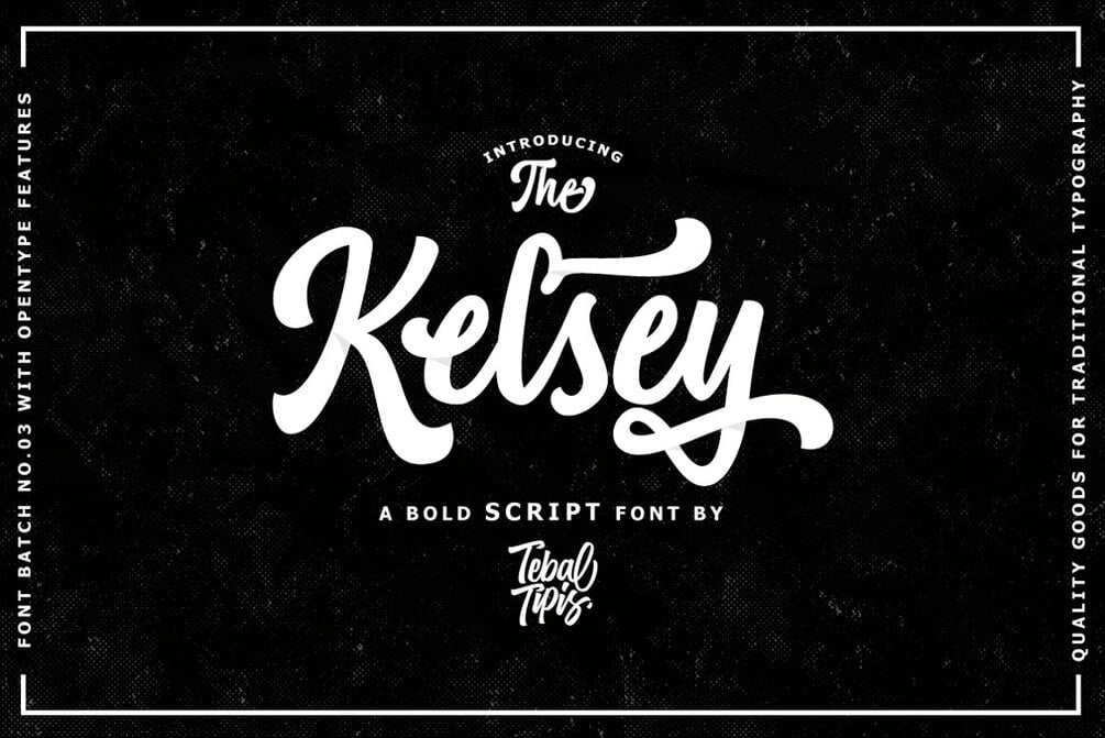 Introducing new latest from TebTipsudio, Kelsey is a script typeface with personality. You can use it as a logo, badge, insignia, packaging, headline, poster, etc The alternative characters in this font were divided into several OpenType features such as Stylistic Alternates, Stylistic Sets, and Ligature. The OpenType features can be accessed by using OpenType program such as Adobe Illustrator, Adobe Photoshop, and Adobe InDesign.