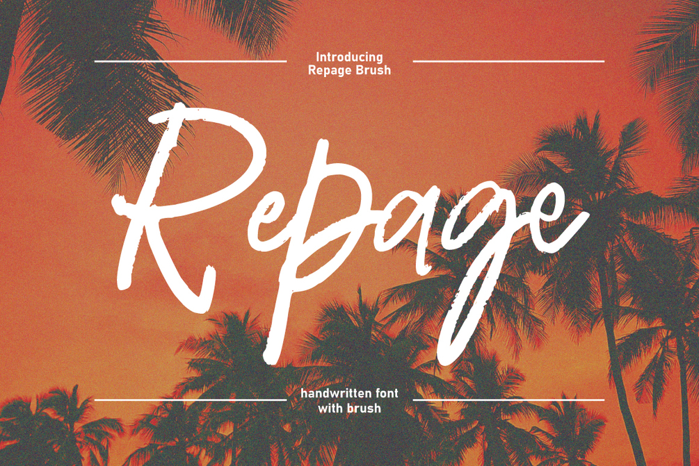 Repage Brush Font is a typeface with personality. You can use it as a logo, badge, insignia, packaging, headline, poster, etc The alternative characters in this font were divided into several OpenType features such as Stylistic Alternates, Stylistic Sets, and Ligature. The OpenType features can be accessed by using OpenType program such as Adobe Illustrator, Adobe Photoshop, and Adobe InDesign.